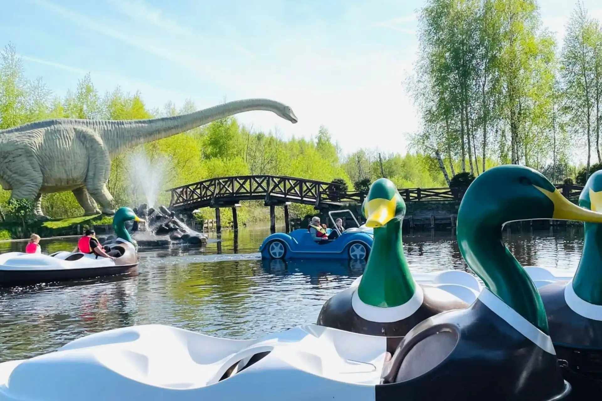 Park tematyczny z naturalnej wielkości dinozaurami, spływami pontonowymi i placem zabaw.